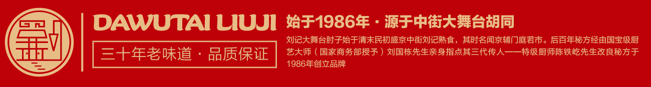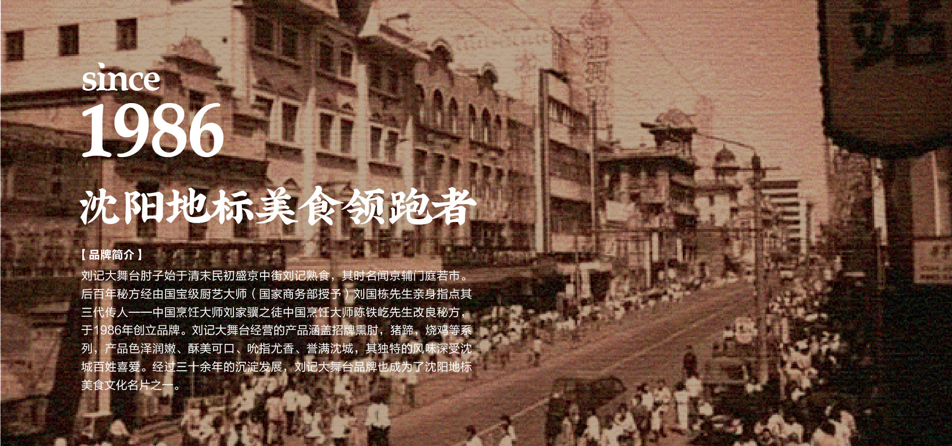 盛京,昔乃大清王朝發(fā)祥之地。劉記大舞臺肘子始于清末民初盛京中街劉記熟食,其時(shí)名聞京輔門庭若市。后百年秘方經(jīng)由國寶級廚藝大師(國家商務(wù)部授予)劉國棟先生親身指點(diǎn)其三代傳人——中國烹飪大師劉家驥之徒中國烹飪大師陳鐵屹先生改良秘方,于1986年創(chuàng)立品牌。劉記大舞臺經(jīng)營的產(chǎn)品涵蓋招牌熏肘,豬蹄,燒雞等系列,產(chǎn)品色澤潤嫩、酥美可口、吮指尤香、譽(yù)滿沈城,遂成古今絕味,其獨(dú)特的風(fēng)味深受沈城百姓喜愛。經(jīng)過三十余年的沉淀發(fā)展,劉記大舞臺品牌也成為了沈陽地標(biāo)美食文化名片之一。